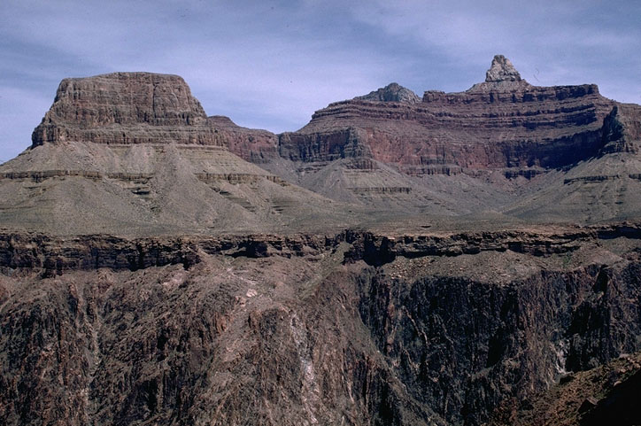 Sequence of Cambrian sandstone (the ledge across the middle of the photo), shale (the overlying slopes) and limestone (the upper cliffs) deposited on top the Vishnu Schist in the Grand Canyon.