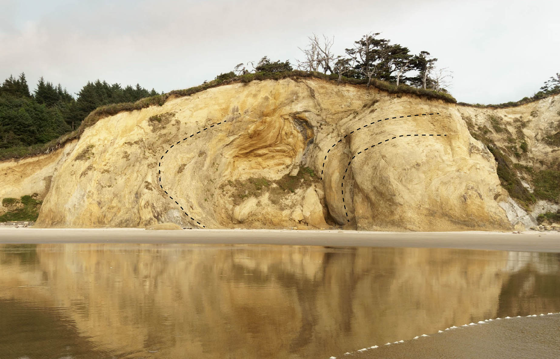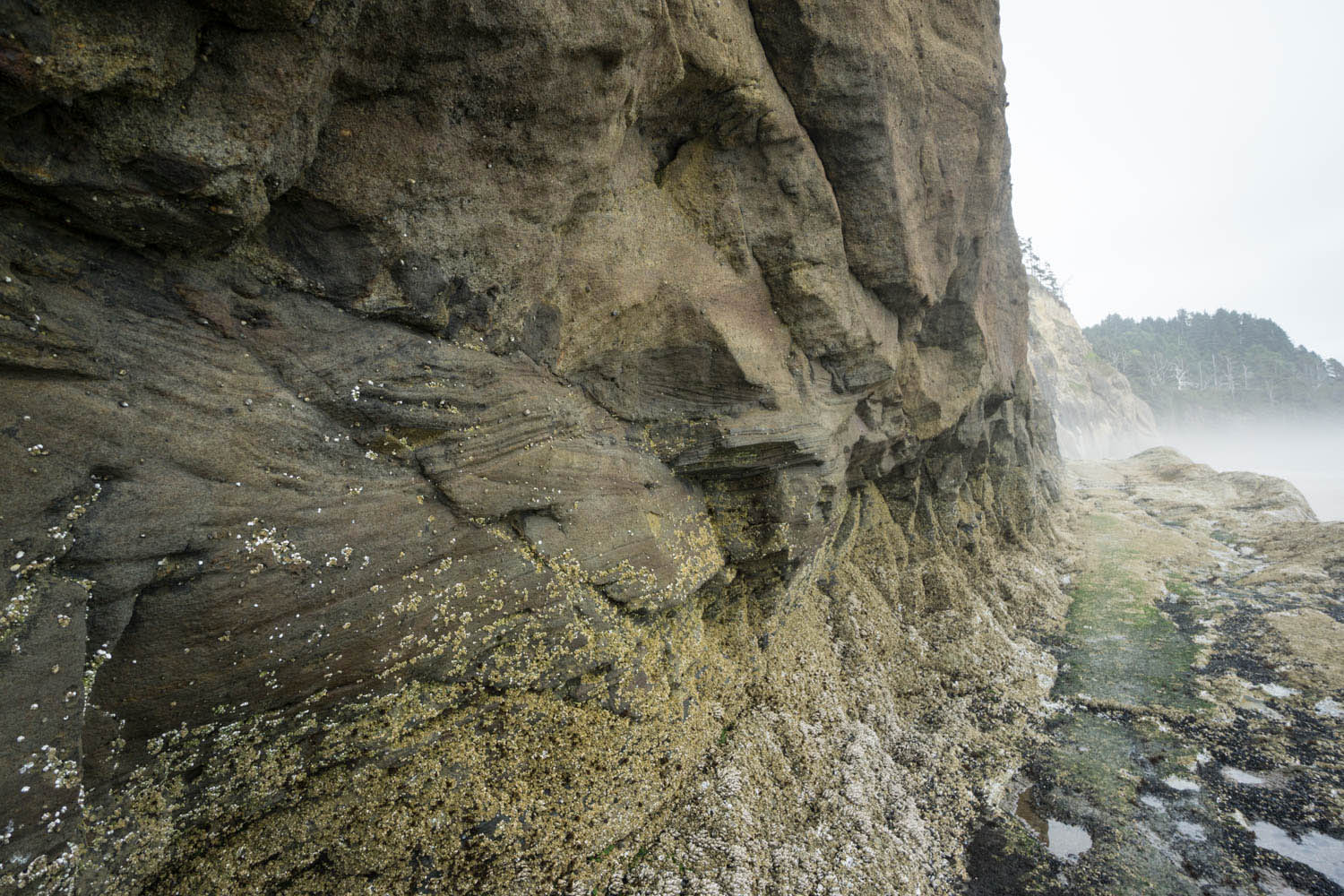Hug Point itself forms the second headland north of the parking area, and it protrudes far enough into the surf that you practically need to “hug” the rocks to get around, hence its name. In the late 1800’s travelers carved a road along the cliff base, which makes passage relatively easy when the tide isn’t too high. Sandstone of the Astoria Formation along this stretch is coarse grained, with mostly quartz and feldspar grains. You can also see abundant cross-bedding from deposition by currents, as well as rip-up clasts, where storms eroded the underlying bed and included parts of it within the newly deposited sand.