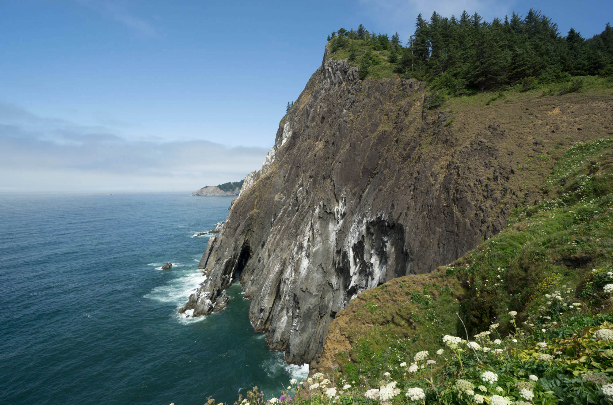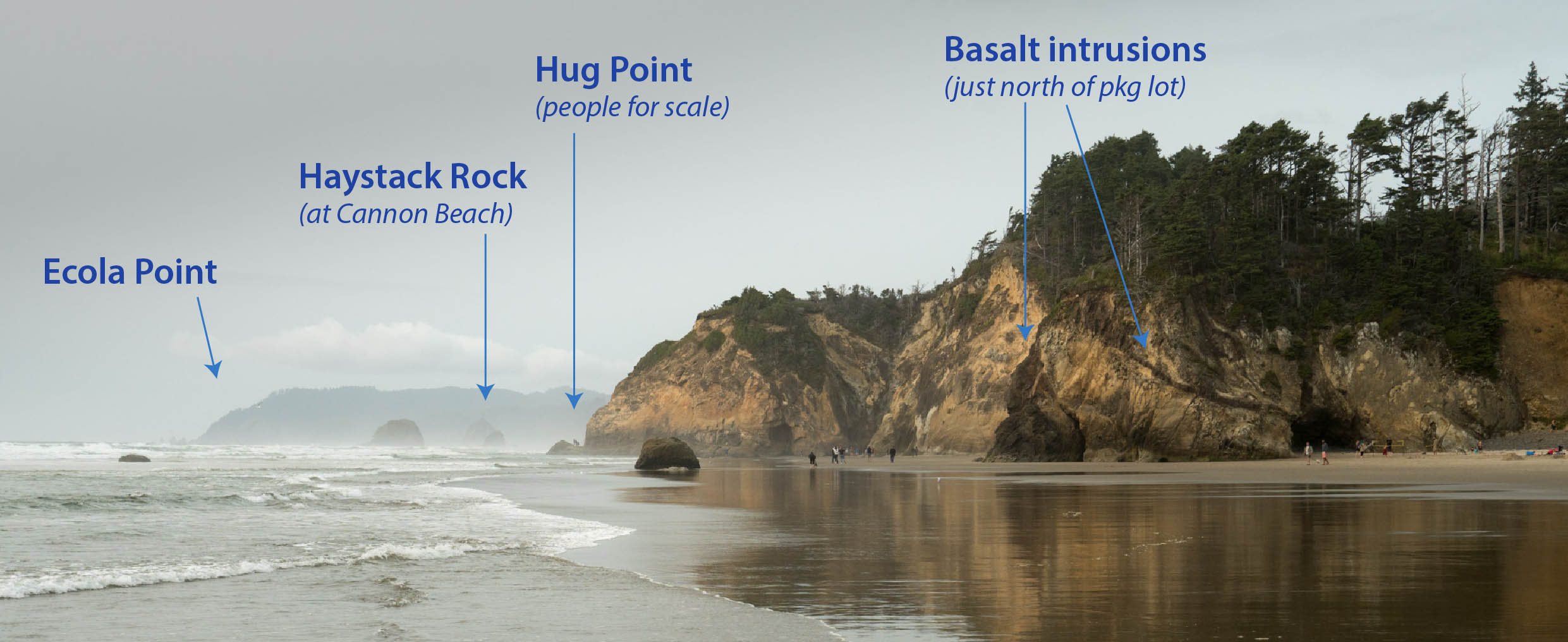 In another mile, you reach Lion Rock and Humbug Point, where the Astoria Formation shows more interaction with the basalt –and another half mile beyond that, Silver Point. There, a cliff exposes shale of the Astoria Formation’s Silver Point member, deposited in a deeper part of the delta complex. As these rocks sit on top the coarser Angora Peak member, they suggest that the delta was subsiding through time. And if you want to keep walking? Cannon Beach’s Haystack Rock is just another two miles away!