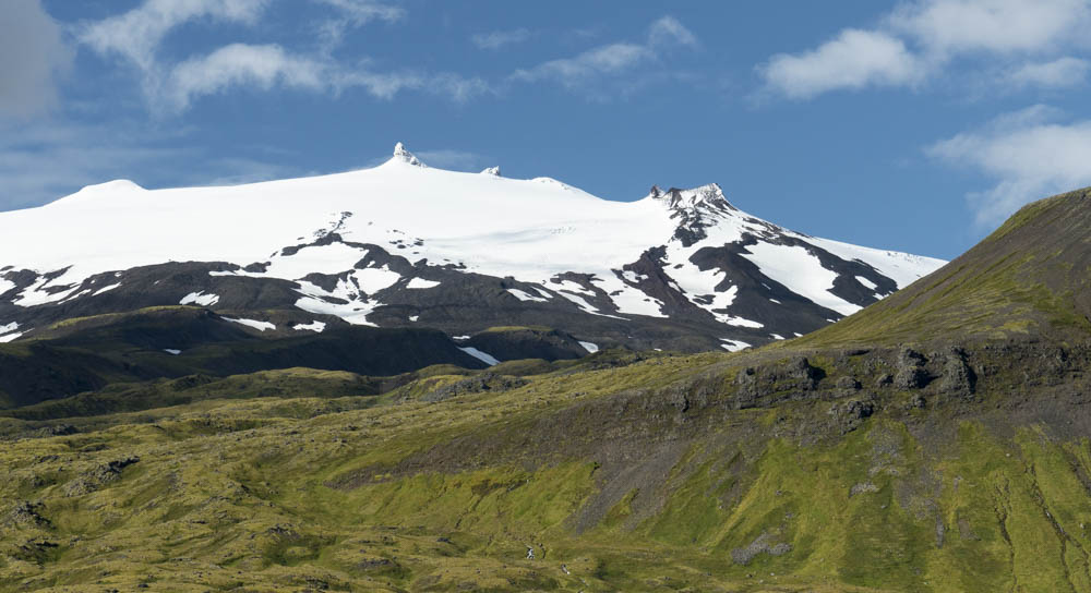 Snæfellsjökull volcano and glacier. There’s a moss-covered basalt flow in the lower part of the photo; the upper reaches of the volcano are more silicic.