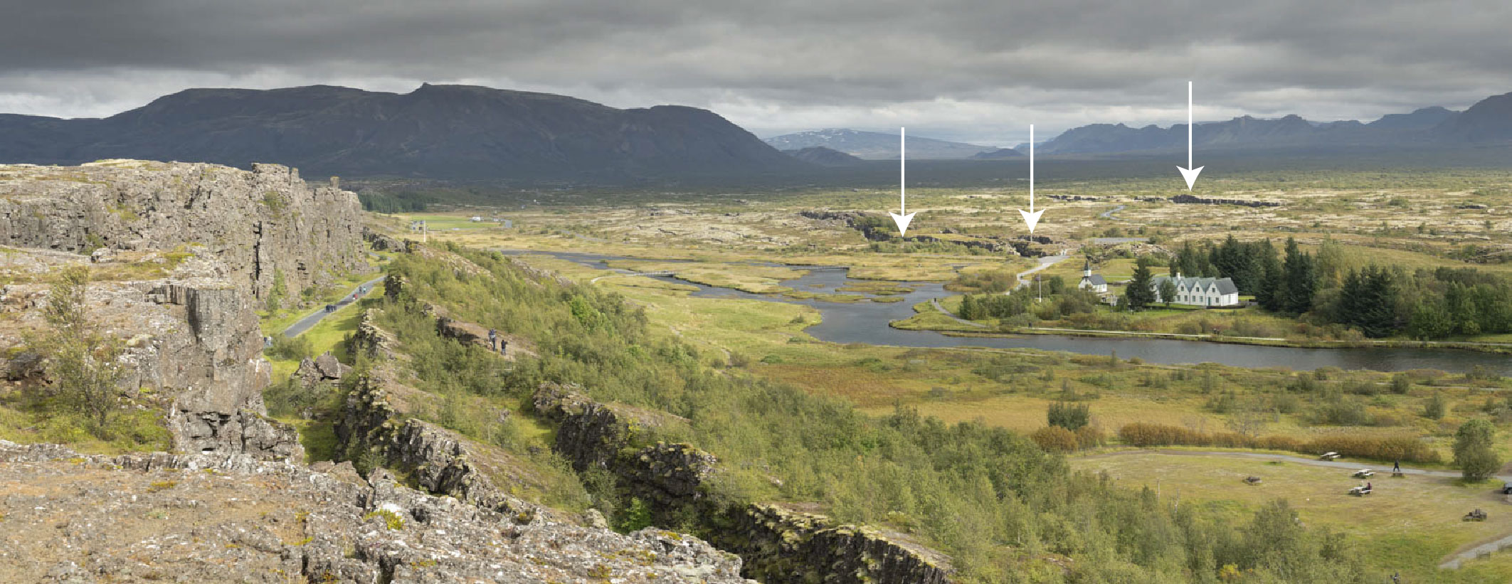 Western Rift Zone at Thingvellir, view northward. Besides the prominent fissures on the left (west), numerous other ones cut the interior of the rift, 3 of which are marked by arrows. The rift continues up the valley behind the arrows.