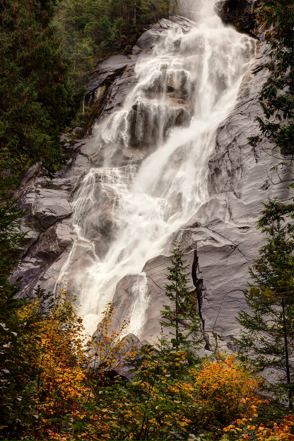 So… the granite speaks to great amounts of time… and the waterfall–it speaks to the changing landscape.  It falls down scoured and smoothed cliffs because the whole area has been shaped by glacial erosion.  Not long ago, this area was under ice!  (Longer though, than the beginning of planet Earth according to the Young Earthers).  You can see some wonderful glacial polish and striations on fluted granite along the highway between the Chief and the town of Squamish.